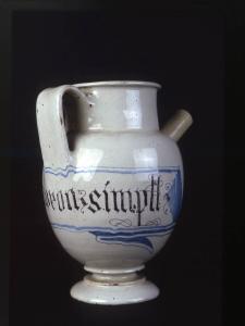 Vaso a corpo globulare molto allungato, spalla corta e arrotondata, comunemente denominato orciolo. Collo alto di forma cilindrica terminante in imboccatura con orlo piatto ed appena estroflesso. Dal collo si diparte un'ansa nastriforme, piatta piuttosto larga. Il beccuccio ha forma cilindrica, molto allungata.\nPiede a calice, alto svasato, decorato da anelli concentrici in rilievo.