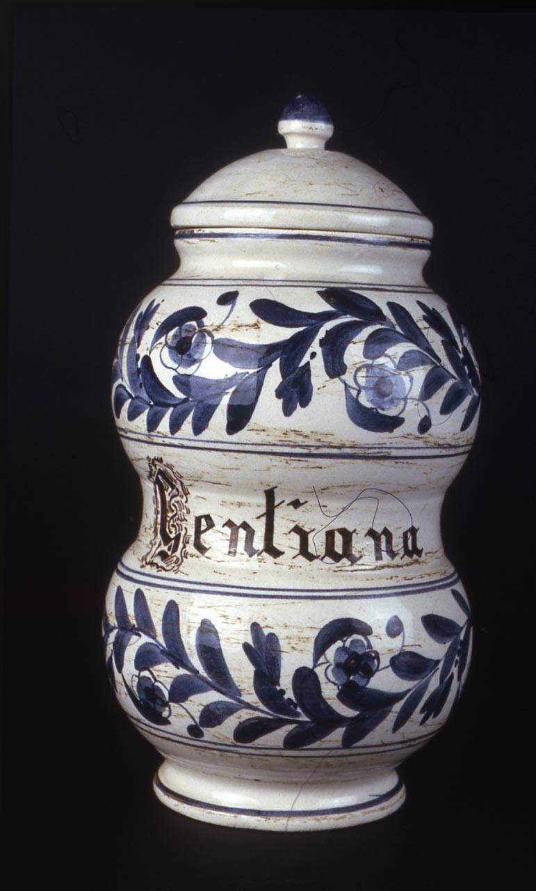 Vaso a rocchetto con spalla e base molto arrotondate e forte strozzatura al centro piede basso e piano, appena distinto da strozzatura, variante tarda dell'albarello a rocchetto. Il collo breve, di forma cilindrica, termina in una imboccatura con orlo piano. Coperchio a cupola con presa arrotondata.