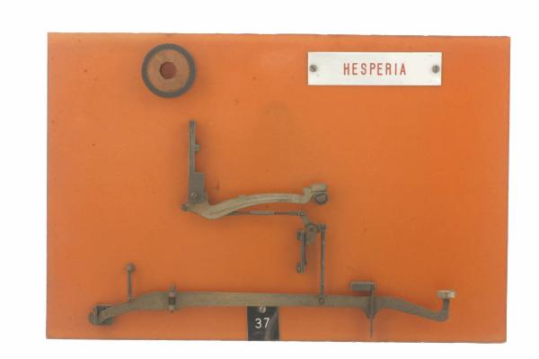 Cinematismo costituito da due elementi in acciaio. La leva curva del tasto ingrana direttamente il martelletto portacaratteri per mezzo di un sistema di leve a due aste poste a 90°. Il bottone del tasto è in gomma dura bianca e riporta la lettera "H", mentre il martelletto è quello della lettera "G". Il movimento di ritorno del tasto è guidato dalla molla a torsione posta all'altro estremo della leva del tasto e prima del fulco della stessa. Il cinematismo è fissato ad un pannello in bachelite.