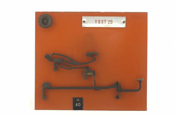 Cinematismo costituito da cinque elementi in acciaio, comprendenti la leva del tasto, il tirante e il martelletto portacaratteri (i caratteri riportati sono: "U" e "u"). Il martelletto batte sul rullo con un movimento a cavalletta. Il bottone del tasto è in celluloide trasparente riportante il carattere " K". Il movimento di ritorno del tasto è guidato dalla molla a torsione, agente sul tirante. Il cinematismo è fissato ad un pannello in bachelite.