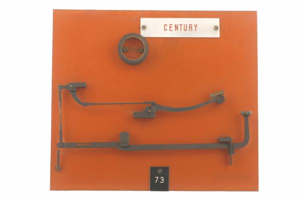 Cinematismo costituito da tre elementi principali in acciaio. La leva del tasto si collega tramite un tirante registrabile ad una leva centrale che tramite un tirante agisce sulla leva del martelletto portacaratteri (i caratteri riportati sono: "6", "Y" e "y"). Le articolazioni tra le tre leve e i tiranti sono cerniere semplici. Il bottone del tasto è in celluloide trasparente su sfondo bianco riportante in nero i caratteri "6" e "Y". Il movimento di ritorno del tasto è guidato da una molla a torsione che agisce sulla leva del tasto. Il cinematismo è fissato ad un pannello in bachelite.