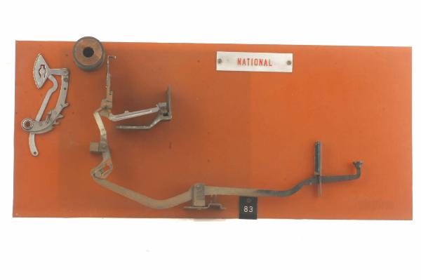 Cinematismo costituito da tre elementi principali in acciaio. La leva molto lunga e sagomata del tasto agisce, tramite una leva centrale che fa da tirante, sulla leva del martelletto portacaratteri (il carattere riportato è "H"). Le articolazioni tra le tre leve sono cerniere a scorrimento. Il bottone del tasto è plastica nera riportante in bianco il carattere "H". Il movimento di ritorno del tasto è guidato da una molla a molla a compressione agente sulla leva del tasto. Il cinematismo è fissato ad un pannello in bachelite rinforzato per una parte sul retro con una lamina in alluminio. Sul fronte del pannello è fissato anche un altro cinematismo non completo formato da una leva con in testa un settore riportante i martelli portacaratteri dei numeri da 0 a 9. Al settore, rotante per mezzo di una cerniera, è collegata un'asta; mentre all'altro capo della leva è articolta un'asta curva cui è collegata una molla.