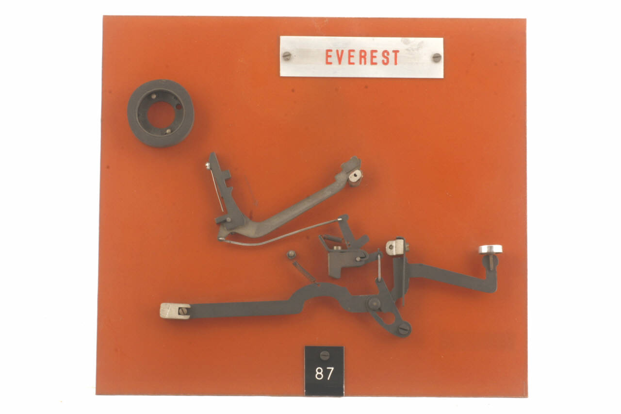 Cinematismo costituito da tre elementi principali in acciaio. La leva sagomata del tasto agisce, tramite una doppia leva centrale che fa da tirante, sulla leva del martelletto portacaratteri (i caratteri riportati sono: "U" e "u"). L'articolazione tra la leva del tasto e la prima parte della doppia leva centrale è una cerniera scorrevole, mentre le altre articolazioni consistono in cerniere cui sono collegati tiranti a genti in trazione. Il bottone del tasto è in celluloide trasparente su sfondo bianco riportante in nero il carattere "W". Il movimento di ritorno del tasto è guidato da una molla che agisce direttamente sulla leva del martelletto portacaratteri ed è aiutato dalle molle a torsione agenti una sul secondo braccio della seconda leva centrale e l'altra sulla leva del tasto. Il cinematismo è fissato ad un pannello in bachelite.