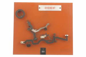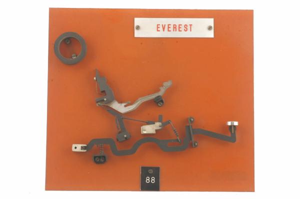 Cinematismo costituito da tre elementi principali in acciaio. La leva sagomata del tasto agisce, tramite una doppia leva centrale che fa da tirante, sulla leva del martelletto portacaratteri (i caratteri riportati sono: "H" e "h"). Le articolazioni tra le leve consistono in cerniere cui sono collegati tiranti agenti in trazione. Il bottone del tasto è in celluloide trasparente su sfondo nero riportante in bianco il carattere "H". Il movimento di ritorno del tasto è guidato da una molla che agisce direttamente sulla leva del martelletto portacaratteri ed è aiutato dalle molle agenti una, a torsione, sul secondo braccio della seconda leva centrale e l'altra, a compressione, sulla leva del tasto. Il cinematismo è fissato ad un pannello in bachelite.