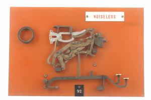 Cinematismo comprendente l'utilizzo di due tasti, fondamentalmente costituito da tre gruppi di leverismi: le due leve dei tasti che si collegano ciascuna tramite un tirante registrabile, ad un'articolato sistema centrale di leve che spinge, tramite un tirante orizzontale posteriore, e solleva o abbassa, tramite un tirante verticale anteriore, un doppio martello portacaratteri. I caratteri riportati dal martello sono: la testa in alto "9" e "5", quella in basso "K" e "k". I bottoni dei tasti sono in celluloide trasparente con sfondo bianco riportanti in nero i caratteri, rispettivamente, "7" e "é" e "H". Il movimento di ritorno dei tasti è guidato da due molle a torsione che agiscono una sulla leva centrale e l'altra, una molla per tasto, sulla leva del tasto. Il cinematismo è fissato ad un pannello in bachelite.