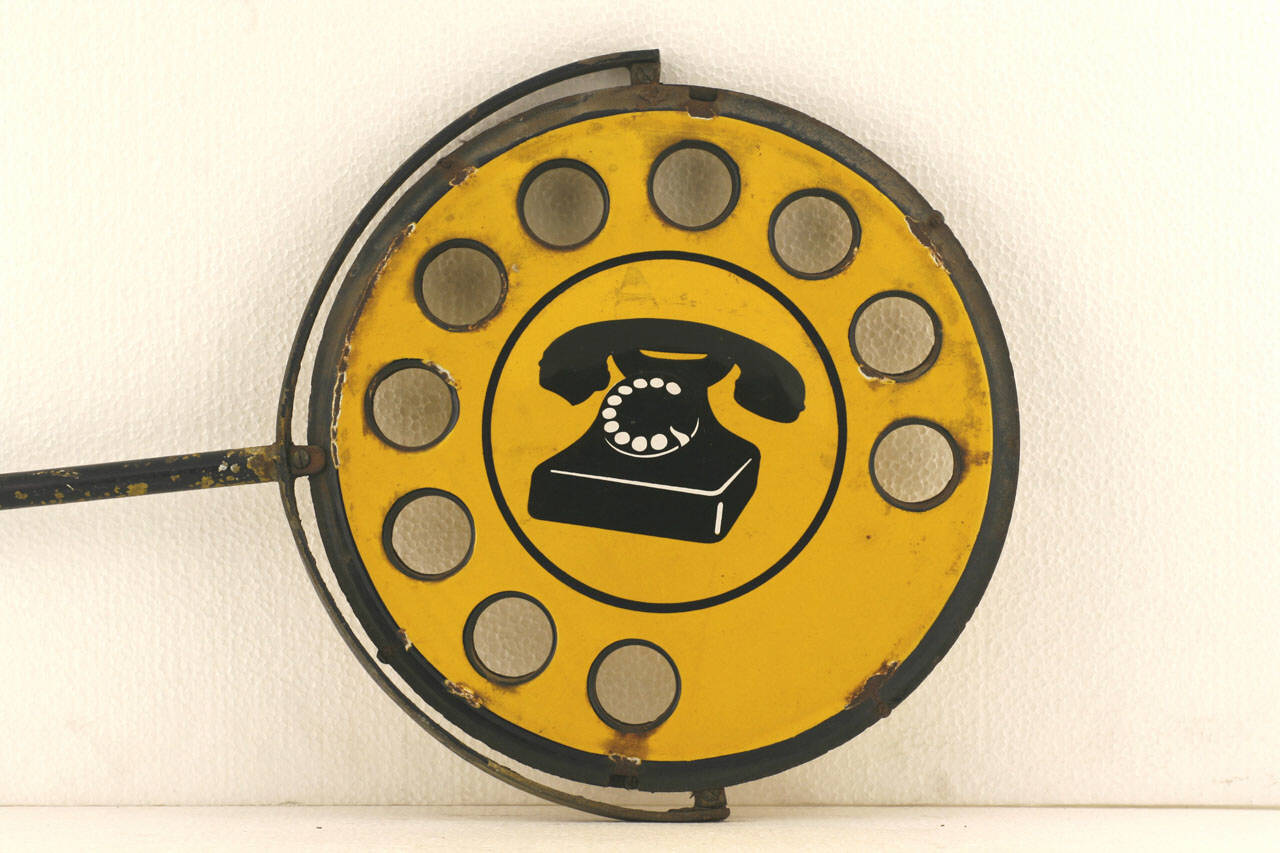 Oggetto bifacciale realizzato in materiale metallico costituito da un'asta che e' fissata alla circonferenza dipinta su entrambi i lati e che la sostiene. Sui due lati di quest'ultima vi e' dipinto lo stesso soggetto: un grande selettore stilizzato graficamente al cui interno troviamo un telefono nero anni trenta tipo telefono a batteria centrale modello 36 della Siemens, ripreso leggermente di tre quarti; il tutto su sfondo giallo e dai contorni dipinti di nero. I fori del selettore stilizzato sono realmente tali.