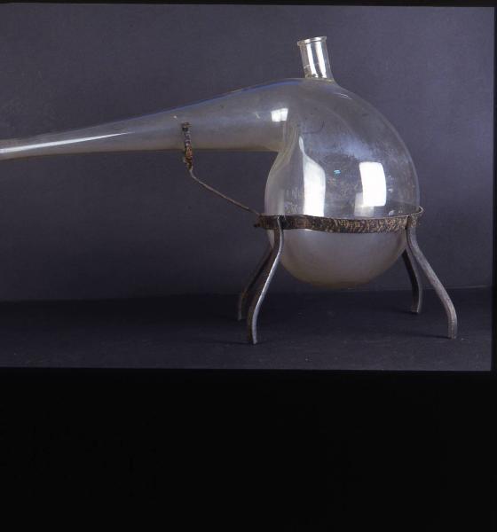 strumento in vetro trasparente con corpo piriforme. L'estremità superiore del corpo si piega a formare un collo lungo che si restringe progressivamente verso la bocca. Dall'estremità superiore si innalza anche un beccuccio cilindrico con il bordo rinforzato. La storta è sorretta da un treppiede in ferro battuto; alla testa circolare del treppiede si innesta, tramite chiodatura, un braccio la cui estremità libera si torce e si biforca a formare una sella atta a sorreggere il collo della storta.