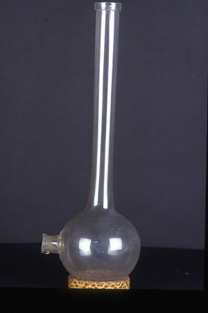 Recipiente in vetro con base sferica e due colli cilindrici con bordo fortemente distinto; il collo più lungo si diparte superiormente, mentre quello più corto è posto lateralmente, a 90° rispetto al primo. Il collo più corto presenta un apporto di materiale vitreo, come di saldatura, sulla zona di contatto con la base sferica.\nA sorreggere il pallone c'è un sostegno in ferro battuto a tre piedi uniti per chiodatura ad un cerchio.