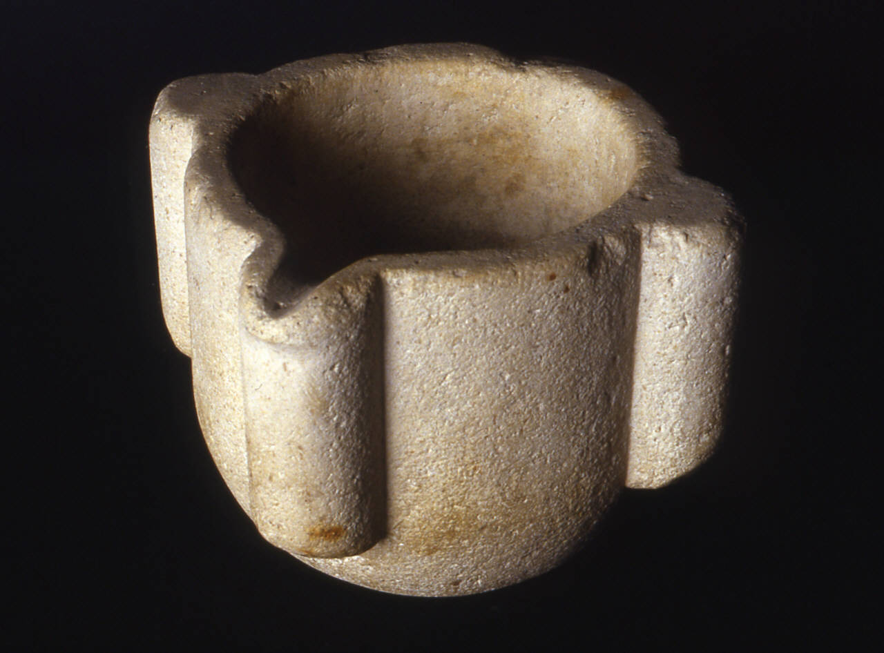 L'oggetto, in pietra martellata a forma emisferica cava, presenta quattro importanti contrafforti emicilindrici equidistanti con funzione di prese, dei quali uno con la sommita forata da un beccuccio.