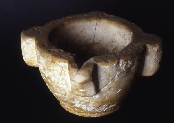 L'oggetto in pietra martellata e levigata, di forma emisferica cava, presenta quattro prese equidistanti, tre di forma emicilindrica e una scolpita a formare un beccuccio.