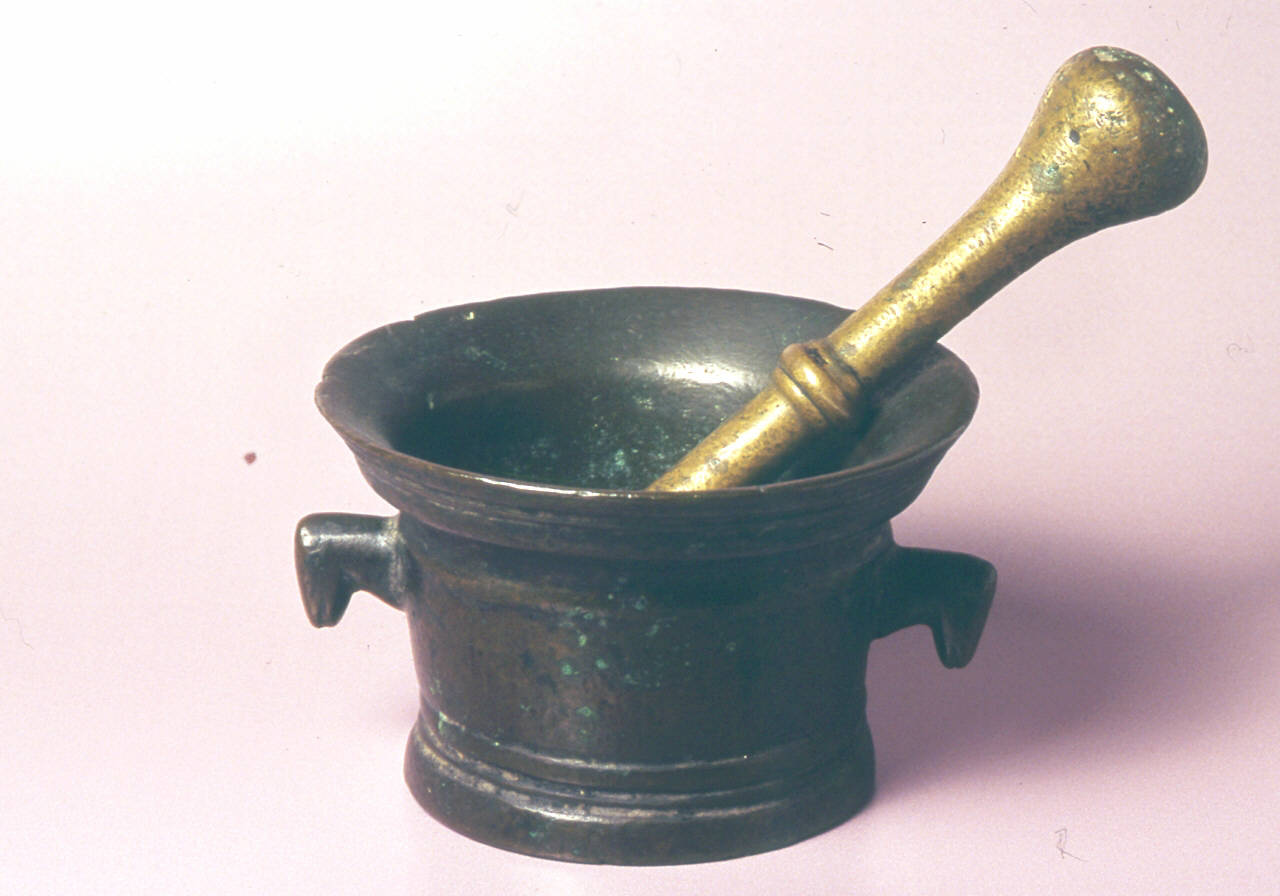l'oggetto, comprensivo di pestello, è in bronzo, cavo, di forma cilindrica svasata al bordo. Presenta il piede marcato e la decorazione a triplo profilo ripetuta anche sul bordo. In posizione opposta l'una all'altra e sotto la svasatira del bordo, sono poste due prese a forma di testa di sepente piegate ad "L" rovesciata. Su tutto il mortaio, ma non sul pestello, si denota una patina di stagnatura leggermente verde. Il pestello, anch'esso in bronzo, si presenta rastremato verso il centro e con uguali impugnature poste ai due estremi. Al centro della rastrematura del pestello, il profilo varia a formare tre bordi anulari coassiali al pestello, due laterali di diametro uguali ed uno maggiore al centro.