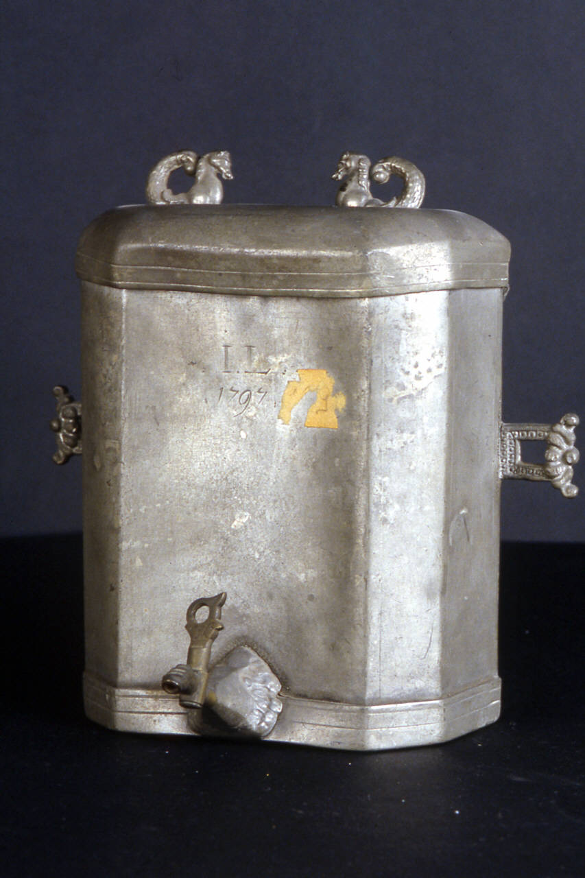 contenitore in peltro a sei facce. Sul lato anteriore, in basso, è presente un rubinetto in ottone; dagli estremi laterali del lato posteriore, sono sporgenti due asole per la sospensione del contenitore; è presente il coperchio che ha la stessa forma del contenitore ed è munito superiormente di due prese a forma di ippocampo.
