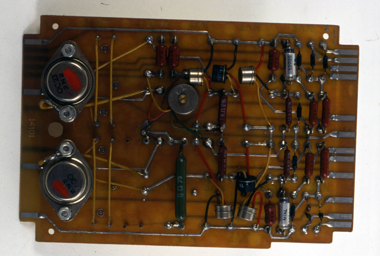 L'oggetto è costitutito da una piastra di bachelite sulla quale è presente un circuito stampato a doppio strato.\nSu di essa sono installati componenti elettronici quali resistori, diodi, condensatori, transistor e nuclei di ferrite.\nIl circuito stampato termina sui due lati corti della scheda sagomati per l'alloggiamento nei connettori di collegamento alle altre parti del sistema.