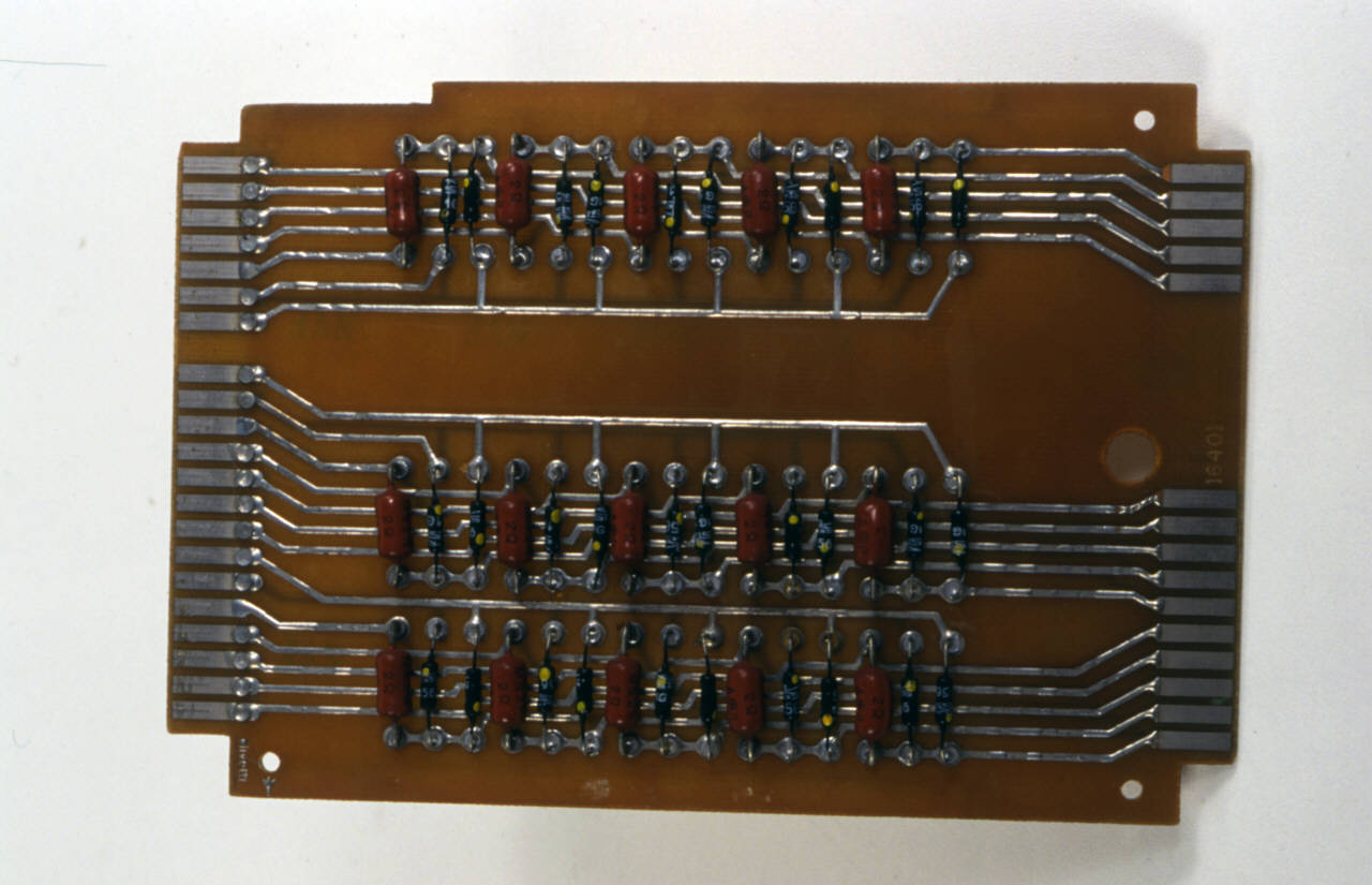 L'oggetto è costitutito da una piastra di bachelite sulla quale è presente un circuito stampato a doppio strato.\nSu di essa sono installati componenti elettronici: 15 resistori e 30 diodi,\nIl circuito stampato termina sui due lati corti della scheda sagomati per l'alloggiamanto nei connettori di collegamento alle altre parti del sistema.