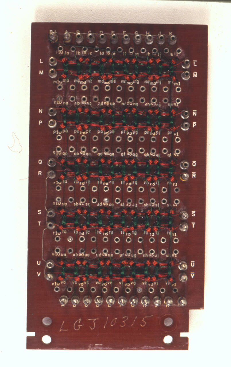 Il dispositivo consiste in una piastra di bachelite avente installati su di un lato una matrice di 100 anellini (nuclei di ferrite); attorno a ciascuno di questi sono avvolte numerose spire di filo di rame di piccolo spessore (0,2 mm) e di due colori differenti, rosso e verde, che uniscono, rispettivamente secondo righe e colonne, i 100 nuclei a 40 terminali metallici (o pin, 10 per lato).\nI pin sono presenti su entrambi i lati della scheda; i 40 pin, di testa e laterali, cioè ai capi delle righe e delle colonne, sono contrassegnati da lettere dell'alfabeto: simmetricamente con lettere semplici e "negate", es. A e A con sopra un trattino e con le lettere che vanno dalla A alla K per le colonne, e dalla L alla V, per le righe.