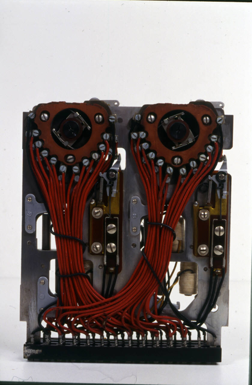 Su una base metallica, costituente la struttura portante, sono inseriti quattro elettromagneti (relé) e due ruote di conteggio metalliche azionate da un sistema di leve di acciaio collegate con i contatti degli elettromagneti. Le ruote di conteggio sono costituite da tre ruote dentate coassiali. \nSul lato opposto della struttura portante, rispetto alle ruote di conteggio, sono visisibili una serie di morsetti a vite uscenti dalle ruote stesse e collegati tramite fili elettrici ad un connettore di materiale plastico inserito ad un'estremità della base. Il complesso dei fili elettrici è suddiviso in fasci di due colori differenti: il rosso che collega i morsetti delle ruote al connettore plastico e quello nero che collega i contatti degli elettromagneti allo stesso connettore.\nUn sistema complesso di leverismi assicura i collegamenti tra gli elettromagneti e le ruote di conteggio.