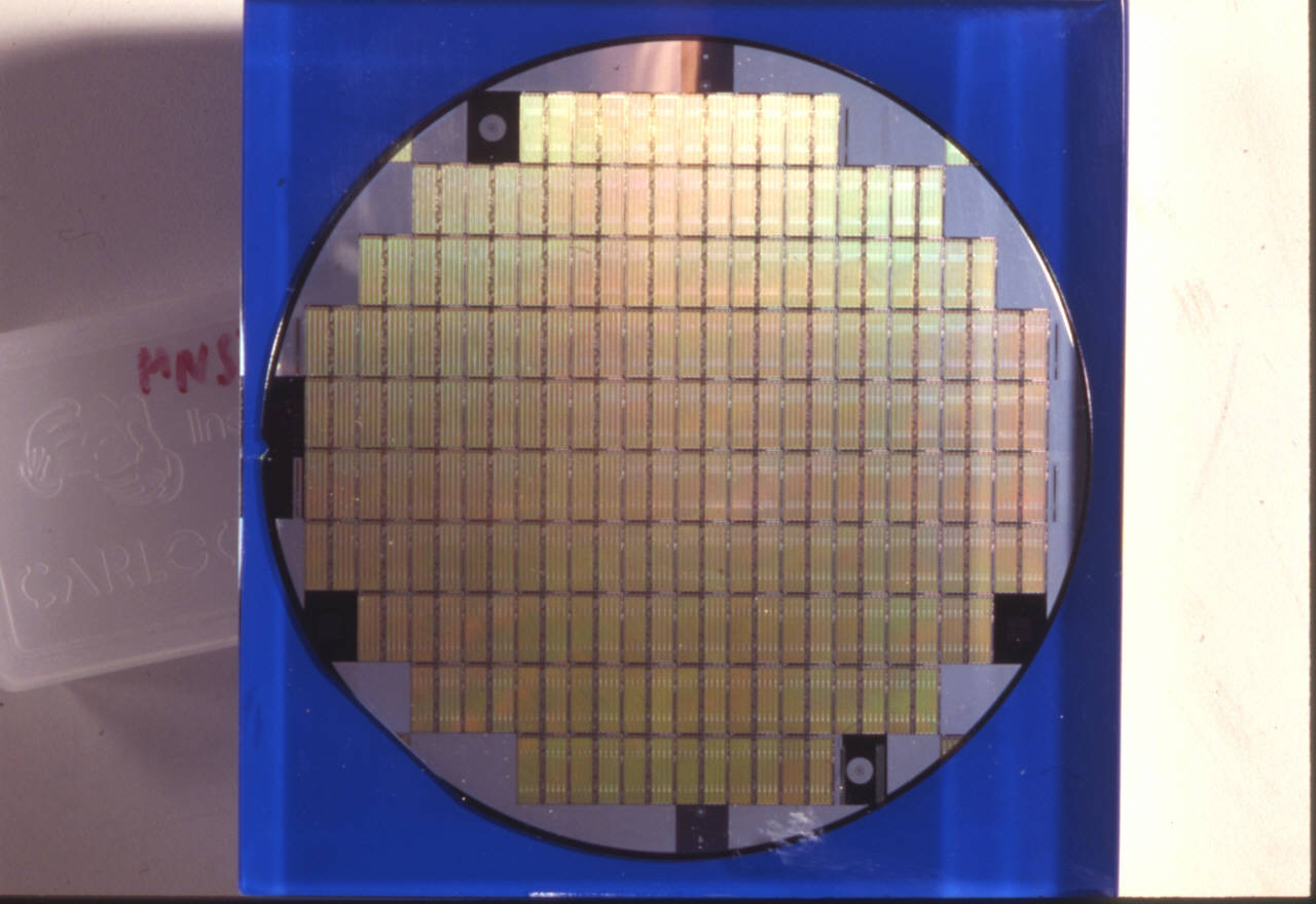 In un parallelepipedo di plexiglass, posizionati ad un paio di millimetri da un foglio di plastica azzurra, è immerso un disco di silicio ( denominato wafer) di spessore inferiore al millimetro.\nSulla superficie del disco sono evidenti 109 figure rettangolari (corrispondenti ai chip) che presentano sulla loro superficie delle micro-incisioni simmetriche rispetto alla mezzeria del lato lungo.\nSono altresì evidenti sei zone rettangolari della piastra, di differenti dimensioni, annerite.