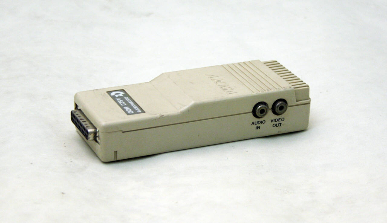 Dispositivo in materiale plastico beige, con, ai due lati opposti, un connettore per il collegamento ad un home computer Commodore mediante porta monitor RGB e un connettore standard UHF RF.\nSul lato destro invece si hanno due boccole per il collegamento in ingresso di audio e video.