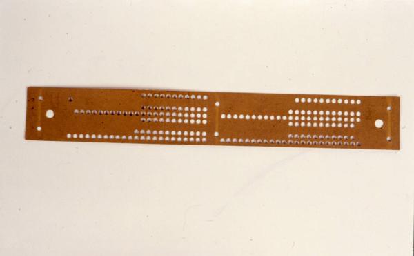 striscia in metallo costituita da due serie di 26 colonne ciascuna (23 presentano fori e 3 no) e 8 righe ( 6 delle quali presentano fori e 2 no). Tra le due serie e simmetricamente ai due lati(3x2 in tutto) una coppia di fori che serve a fissare la scheda sul perfotatore (vedi scheda NCTN0302039764).