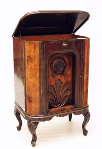 Mobile in legno e radica con una serranda nella parete frontale che protegge i comandi e un coperchio apribile. Poggia su quattro piedini sagomati. All'interno del coperchio superiore era presente il giradischi, attualmente mancante insieme al motore elettrico e al relativo circuito. Apertura del giradischi e serranda si possono chiudere con una serratura.\nI comandi del radioricevitore consistono in una manopola superiore per la sintonia (ricezione di onde medie), quella di sinistra per l'accensione e la regolazione del volume, quella di destra aziona un commutatore per la tonalità radio/fono. Il potenziometro del volume è a doppia sezione una per la radio e l'altra per il giradischi.\nSopra alle manopole si ha una scala di sintonia semicircolare con indicazioni numeriche da 20 a 56.\nSotto ai comandi, protetto da un tessuto e una decorazione in legno intagliato, si ha l'altoparlante circolare.\nIl retro è aperto, senza pannello, ed è visibile il circuito supereterodina a 8 valvole. Si hanno inoltre due connettori per la messa a terra e il collegamento dell'antenna.