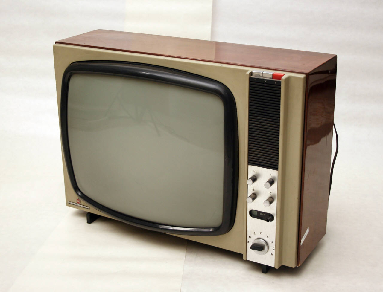 Televisore con mobile in legno verniciato in poliestere e profili in plastica color beige e grigio. Poggia su piedi in metallo.\nGran parte della parete frontale è occupata dallo schermo rettangolare del cinescopio da 19 pollici, autoprotetto.\nA destro dello schermo, in colonna, si trovano due tasti per il passaggio dal 1° al 2° programma della televisione italiana (il primo VHF e il secondo UHF), una griglia che protegge l'altoparlante circolare interno, quattro manopole per la regolazione di volume, luminosità, contrasto e toni, una manopola per la selezione dei canali UHF (con indicazioni numeriche da 4,7 a 7,9) e un selettore per i canali da A ad H delle bande VHF.\nIl retro, in plastica nera, è forato per permettere l'aerazione e su di esso si trovano viti per la regolazione di ampiezza verticale, tensione verticale, linearità verticale, ampiezza orizzontale, tensione orizzontale, alimentazione elettrica. Si ha inoltre una presa per antenna a 300 Ohm. E' presente il cavo di alimentazione per la connessione alla rete elettrica.\nIl circuito interno ha funzioni di valvole: n°38.