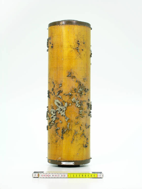 Cilindro in legno con elementi in rilievo e con anima cilindrica cava in ferro: i contorni dei motivi sono delineati da lamine metalliche infisse nel legno del cilindro e sporgenti da questo per alcuni millimetri; l'interno dei motivi è riempito di pasta di legno (?). I motivi in rilievo sono quelli che dovranno essere stampati di uno stesso colore: il disegno è però tracciato per intero a china sul cilindro. Alla base del cilindro è applicata una targhetta metallica riportante il numero del disegno: 1015/88; sulla superficie del cilindro è scritto a mano "verd scuro" ad indicare probabilmente il colore da stampare e "14". Mancano gli altri cilindri componenti il disegno completo