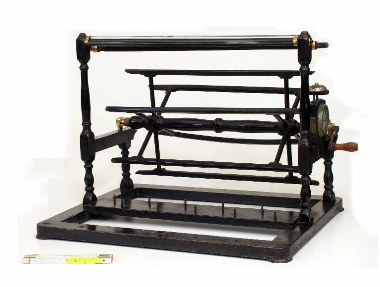 La base dell'apparecchio porta un listello con una serie di perni metallici per l'alloggiamento dei rocchetti da svolgere. Poco oltre, nella parte alta dello strumento, due bacchette di vetro a breve distanza fra loro forniscono appoggio ai fili che, scendendo dopo lo svolgimento dai rocchetti, proseguono passando attraverso i barbini in vetro di una barbiniera. Segue un aspo a sei appoggi, azionabile manualmente, che raccoglie i fili in svolgimento. Il movimento è impartito da una manovella calettata sul perno dell'aspo, che ingrana in una vite senza fine. Un meccanismo contagiri dotato di campanello, consente di misurare 400 giri, pari a 450 m, cioè alla lunghezza standard di un "provino" di seta.
