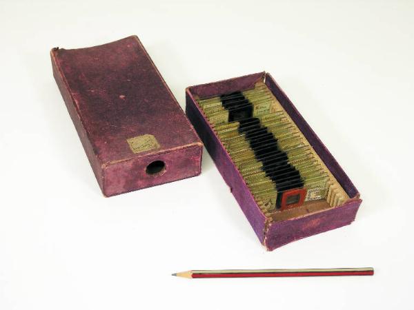 L'oggetto si compone di una scatola di cartone originale corredata da una rastrelliera di legno, dove alloggiano n°27 vetrini da microscopia ottica preparati con fibre tessili.