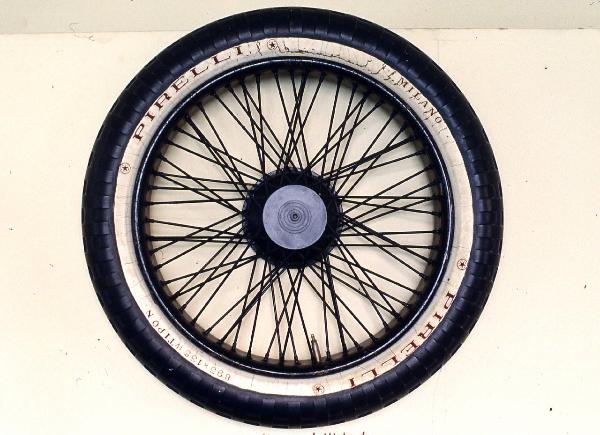 Ruota con cerchione, mozzo e raggi in metallo e ricoperto con pneumatico a battistrada con nervature. Lo pneumatico è bicolore: la fascia bianca, prossima al cerchione, riporta in rosso la tipologia dello pneumatico, il nome della società costruttrice e la sua città sede ("Pirelli / 895 x 135 / IV tipo N / Pirelli / Milano"); mentre è nera la restante parte e il battistrada.