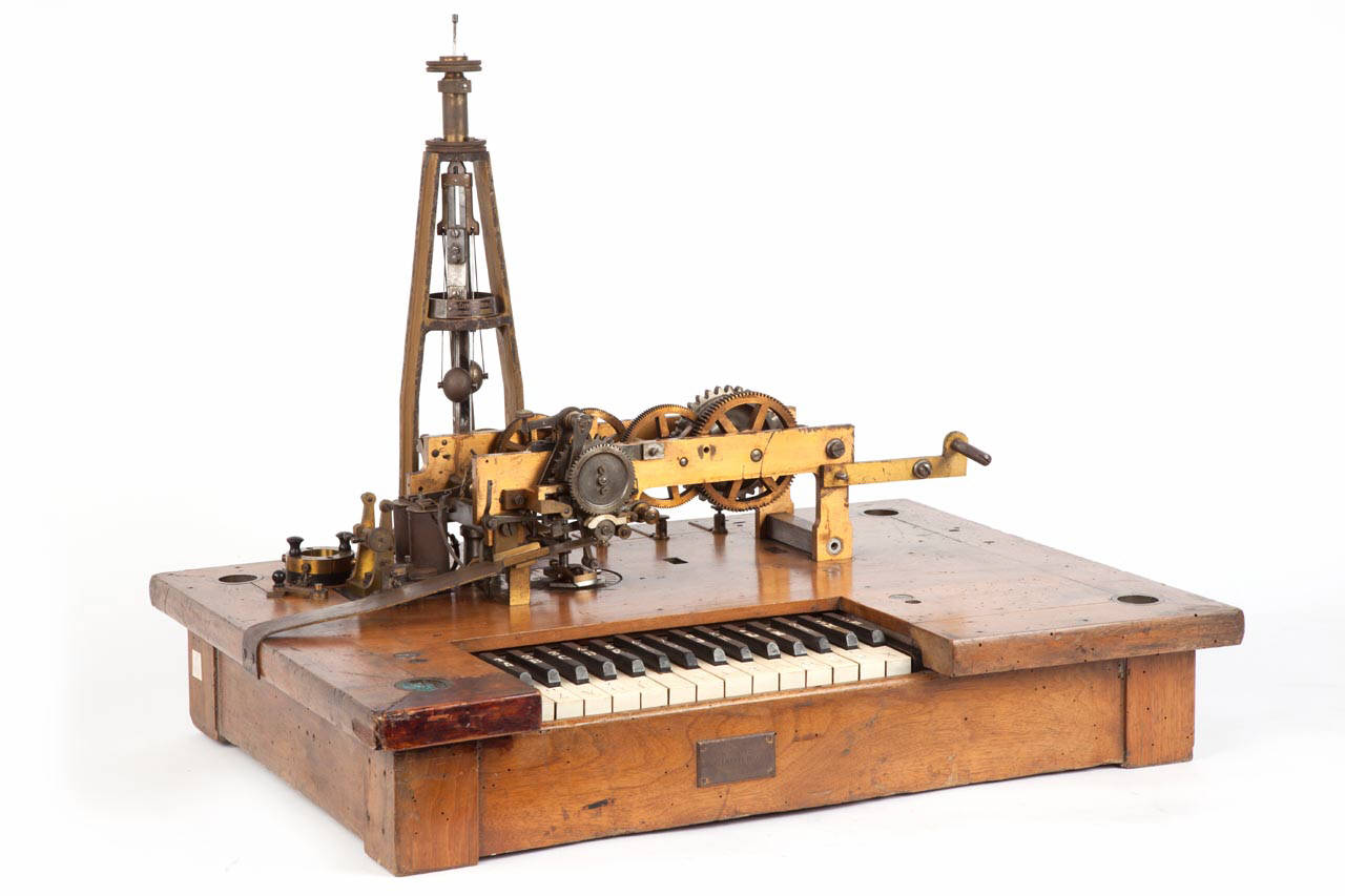 Sistema elettromeccanico per la comunicazione a distanza dotato sia della parte trasmittente, che di quella ricevente. La parte ricevente è fornita di una ruota munita di caratteri tipografici (ruota dei tipi) sincronizzata, tramite un dispositivo centrifugo ad orologeria, allo scorrimento di un nastro di carta su cui viene stampato in chiaro il messaggio. La forza motrice è data dalla caduta di un grave e il sistema di bloccaggio del meccanismo è a pedale; entrambi questi dispositivi sono mancanti.\nLa parte trasmittente è formata dalla tastiera che riporta sui tasti gli stessi caratteri della ruota dei tipi.