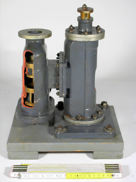 L'oggetto è un modellino didattico in legno verniciato che illustra il funzionamento di una pompa meccanica di tipo centrifugo. Etichetta metallica: "G. Costa e Giraudo - Modellatori - Torino"