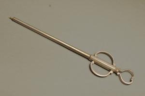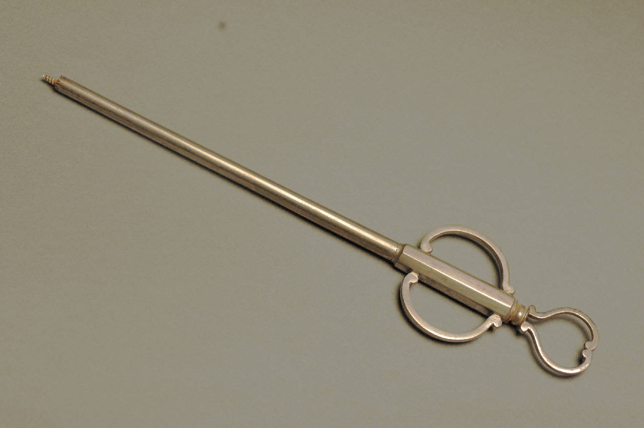 Lo strumento è costituito da una guaina d'acciaio, dotata di alcuni piccoli denti all'estremità, nella quale può scorrere un'asta più sottile, che termina con una punta acuta a vite. Un manubrio, posto all'estremità dello strumento, consente di manovrare quest'asticciola e di farla scorrere verso l'esterno. Due anse poste sulla guaina servivano per impugnare saldamente lo strumento.