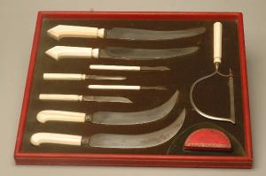 Scatola priva di coperchio. rivestita di pelle rossa con decorazioni dorate, foderata di velluto verde. All'interno sono posizionati nove strumenti chirurgici, tra i quali coltelli falcati e semifalcati, utilizzati per l'amputazione degli arti e una scatoletta rivestita di pelle rossa che probabilmente conteneva una serie di aghi.