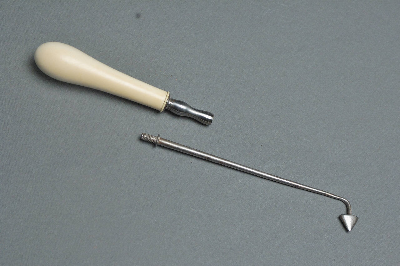 Asta metallica ricurva, terminante con una punta a sezione triangolare. La filettatura permetteva di avvitare lo strumento su una qualsiasi delle impugnature a disposizione nello strumentario per la cauterizzazione.