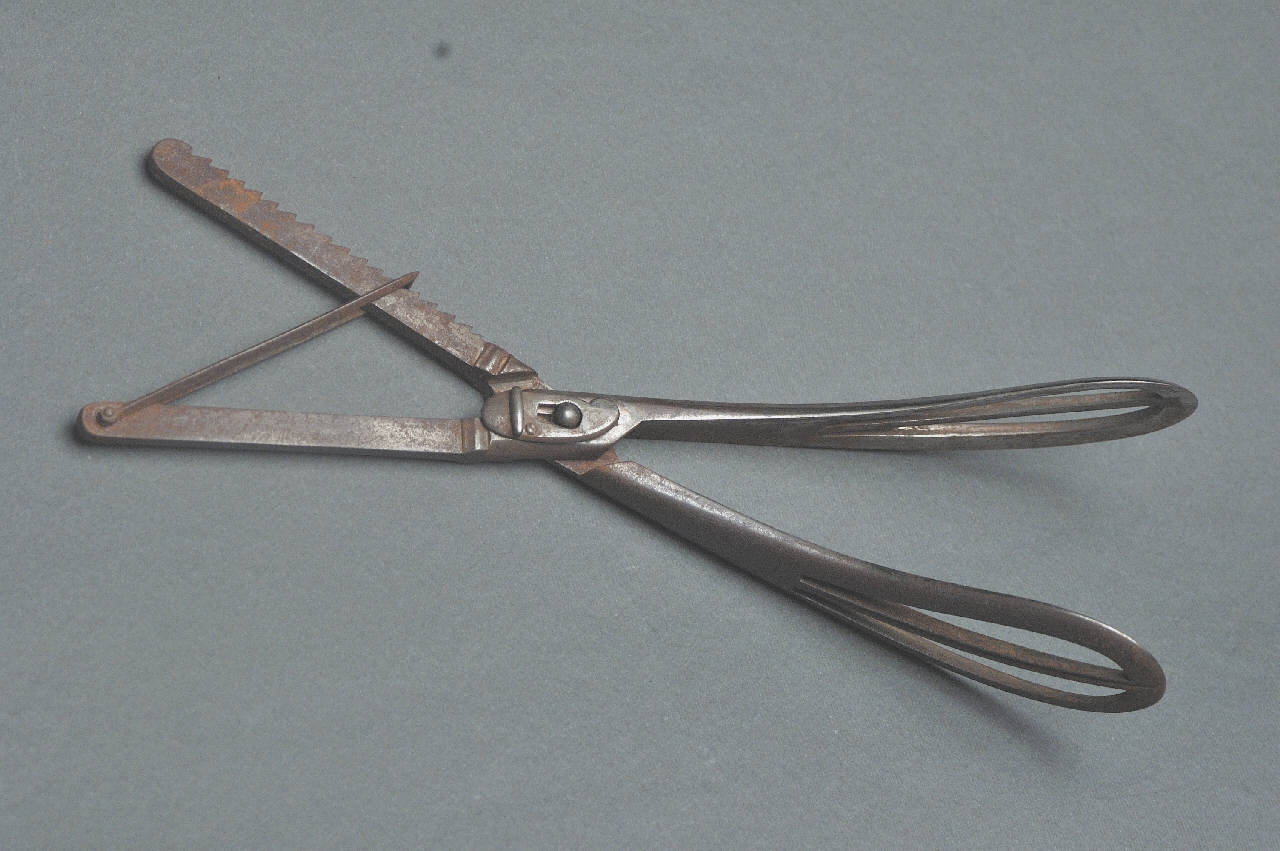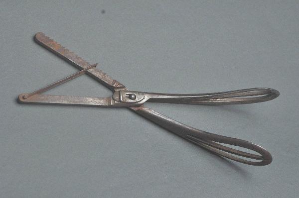 Strumento costituito da due bracci incrociati, uno dei quali presenta l'estremità inferiore a dente di sega. Entrambe le estremità superiori sono a cucchiaio, a doppia fenestratura.\nNel punto di articolazione dei due bracci è presente un sistema di bloccaggio a chiavistello del perno di uno dei bracci nel foro dell'altro.\nSull'estremità inferiore senza dentellatura è fissato un fermo rettangolare che, incastrandosi nella parte a denti di sega, permette il bloccaggio dell'apertura. Si tratta di una pinza a presa automatica continua.