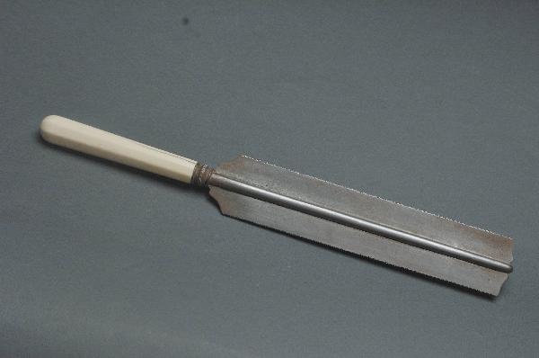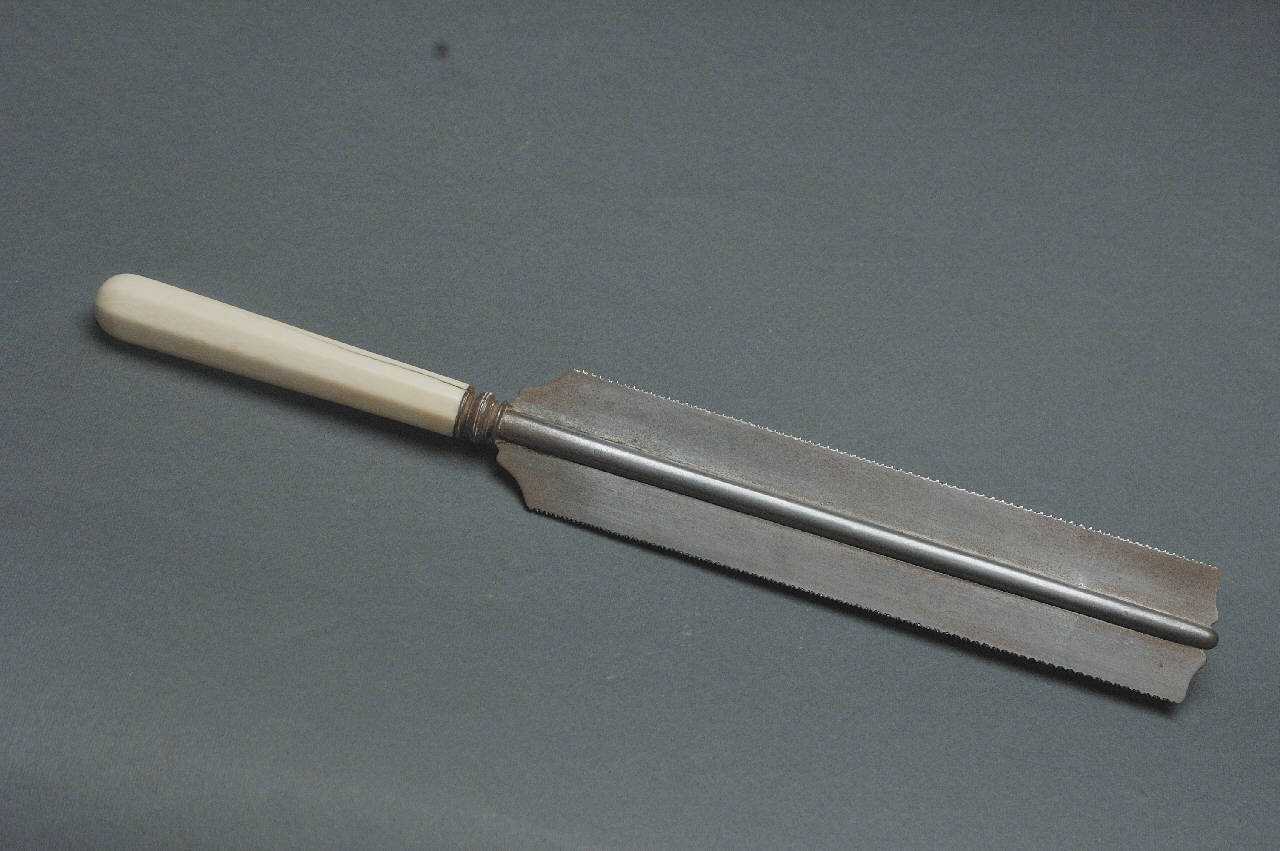 Sega dritta, dentata su entrambi i lati, dotata di un'impugnatura di avorio a sezione ottagonale, parallela al senso del taglio. Sull'impugnatura è montata una barra centrale alla quale sono fissate, tramite tre viti, due lame dentate.