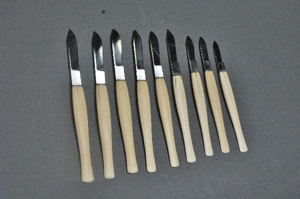 Bisturi con impugnatura di avorio e lama di acciaio, sagomata e tagliente sulla parte convessa.