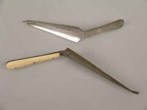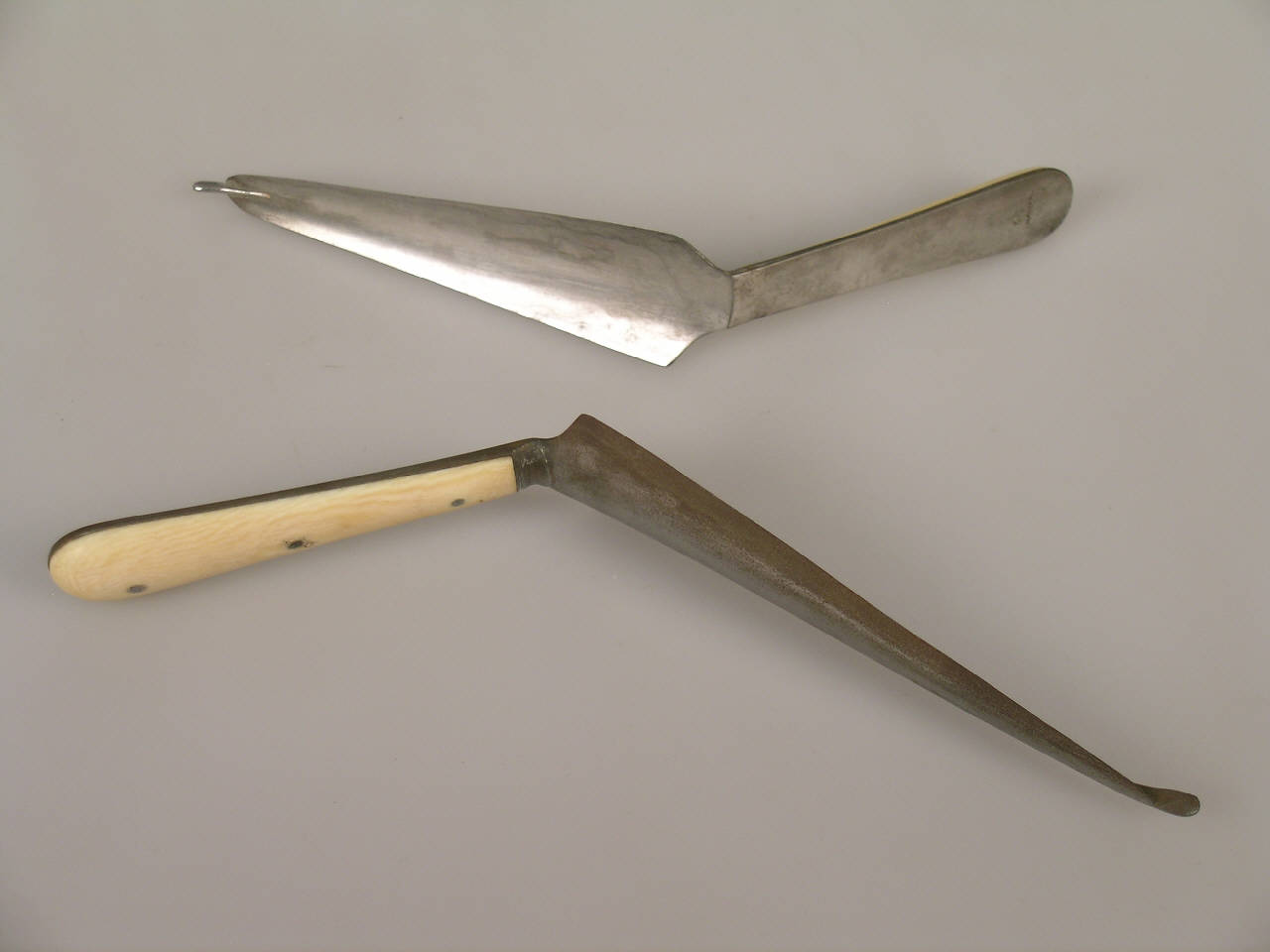 Gli strumenti sono dotati di una sorta di lama, di forma triangolare, concava dalla parte interna e tagliente su un solo margine (il primo lungo il margine sinistro, il secondo lungo il margine destro). Sull'estremità della lama è presente un nodulo che serviva per manovrare lo strumento insieme al catetere scanalato, facendo combaciare il nodulo con il solco del catetere. La lama si prolunga, piegandosi ad angolo ottuso, in una impugnatura, ricoperta d'avorio su un solo lato.
