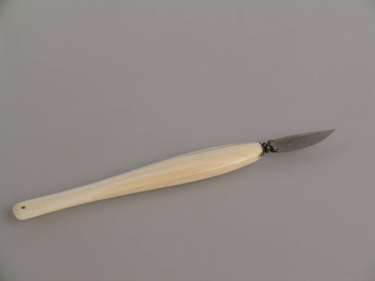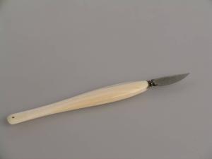 Su una impugnatura di avorio sagomata è montata una piccola lama appuntita e tagliente lungo il lato convesso.