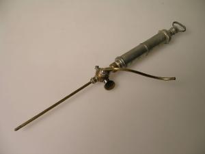 Sifone dotato di due cannule. La prima, che poteva essere diritta (come quella montata sullo strumento) o curva (prevista nella dotazione della scatola e oggi mancante), si introduceva all'interno della ferita e serviva sia per iniettare eventuali sostanze medicamentose sia per asportare l'umore che si desiderava estrarre. La sostanza defluiva in un vaso attraverso la seconda cannula. Un piccolo rubinetto posto alla base delle due cannule poteva essere aperto o chiuso in modo da regolare il flusso del fluido.