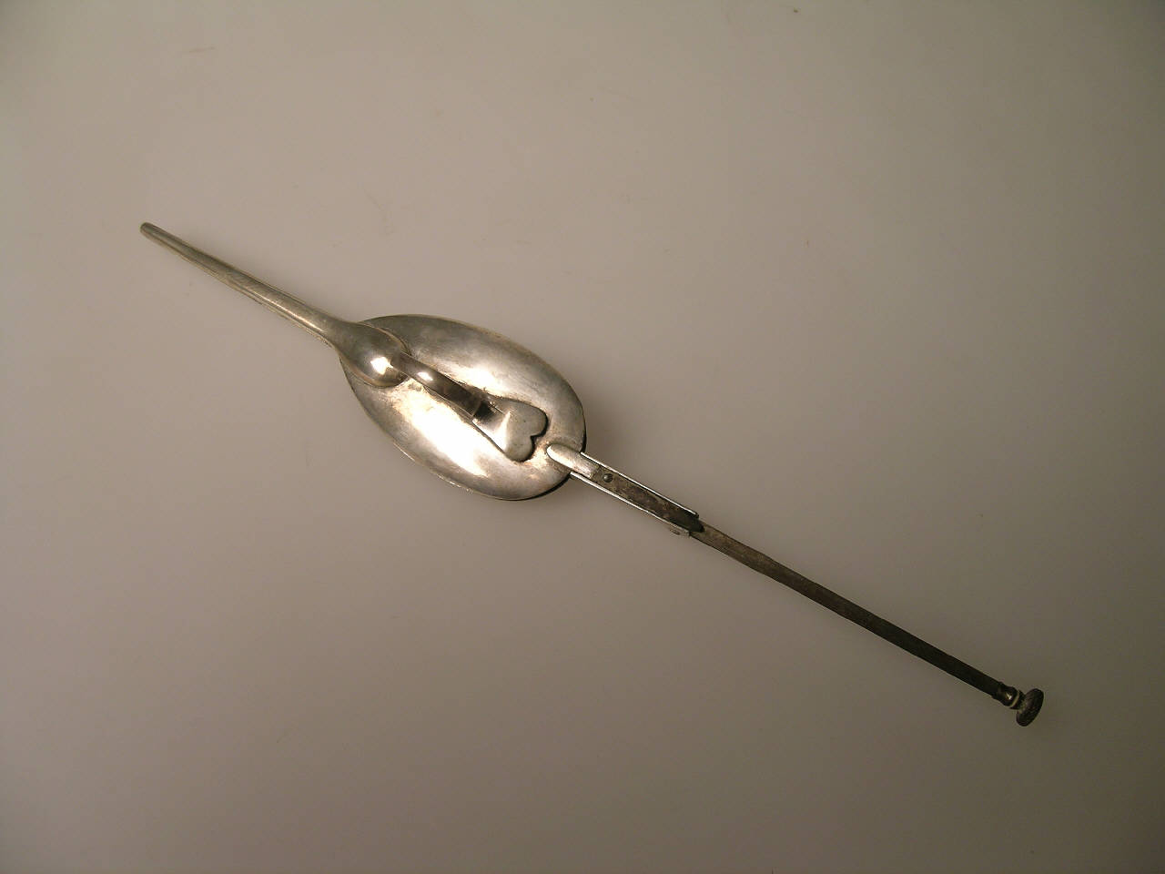 Lo strumento è costituito da una guaina d'argento sagomata, all'interno della quale è nascosta una lama. la guaina è costituita da un corpo di forma ovale (sul quale è fissato un anello che ne facilita l'impugnatura) che si allunga in una punta dall'estremità arrotondata. Una piccola leva blocca o consente di sbloccare e far scorrere la parte interna dello strumento, costituita da una lama a doppio tagliente di forma ovale innestata du una barretta di metallo grazie alla quale essa può scorrere all'esterno della guaina.\nLo strumento è dotato anche di una seconda lama, anch'essa a doppio tagliente.