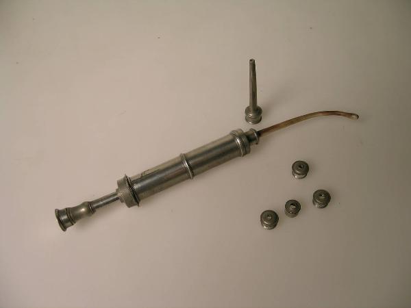 Siringa in acciaio dotata di una cannula in avorio, leggermente curva, inserita ad incastro e fissata da un fermo dotato di un foro centrale - attraverso il quale passa la cannula - che si avvita al corpo della siringa stessa. Altri fermi, con fori differenti, servivano a fissare cannule di differente diametro. Altre cannule potevano essere direttamente avvitate al corpo centrale della siringa.\nL'estremità del pistone, cavo in tutta la sua lunghezza, è dotata di un coperchietto a vite che può essere tolto nel caso in cui sia necessario far fuoriuscire del liquido per quella via.\nLa cavità del cilindro serve anche per riporre e proteggere altri accessori. Al suo interno è presente una cannula dritta, in avorio.