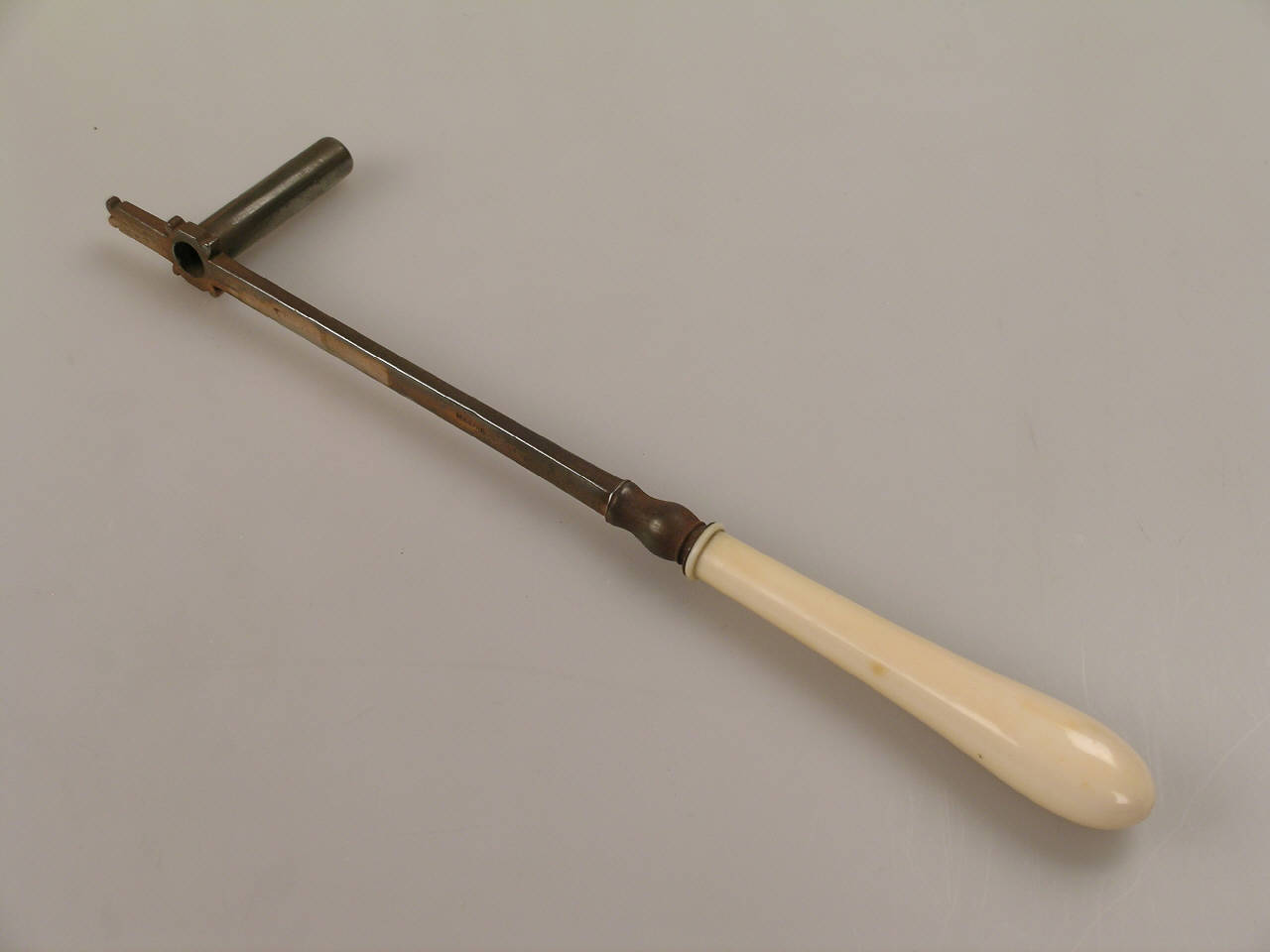 Su un manico in avorio si innesta una lunga barra di acciaio, sulla quale si trova, quasi all'estremità, un cilindro cavo perpendicolare rispetto al corpo dello strumento.