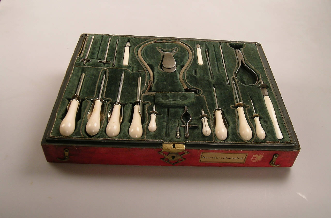 La cassetta, priva di coperchio, rivestita di pelle rossa con decorazioni a secco lungo i bordi e foderata di velluto verde. \nIn essa sono posizionati, in appositi alloggiamenti (alcuni dei quali contornati da passamaneria dorata), strumenti e accessori utilizzati per operazioni volte al drenaggio di fluidi e per interventi al collo e al tronco.