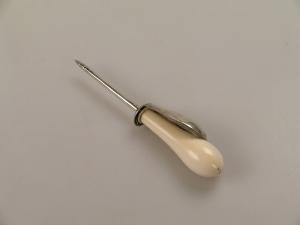 Lo strumento è costituito da una lunga punta di acciaio, dotata di una impugnatura di avorio. La punta è contenuta in una cannula d'argento alla quale è saldato, verso l'impugnatura, un dispositivo a cucchiaio. All'estremità opposta la cannula è dotata di due fori di forma allungata.