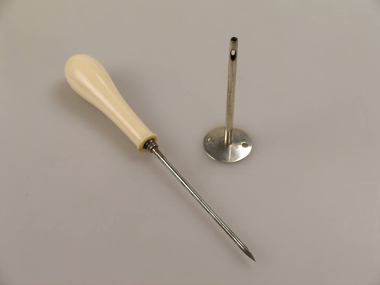 Lo strumento è costituito da una punta di acciaio, dotata di una impugnatura di avorio e contenuta in una cannula d'argento. La cannula termina, dalla parte dell'impugnatura , in una base rotonda, dotata di due piccoli fori, attraverso i quali si poteva far passare un filo per fissare la cannula al corpo. L'estremità opposta della cannula è dotata di due fori oblunghi.