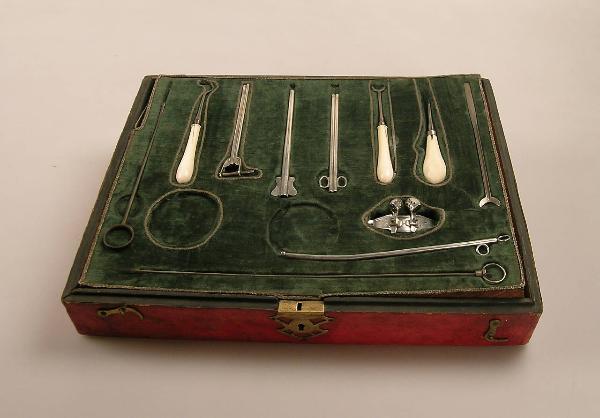 Scatola, priva di coperchio, rivestita di pelle rossa con decorazioni a secco lungo i bordi e foderata di velluto verde. Sul lato anteriore sono presenti, ai lati, due ganci che assicuravano la chiusura e, al centro, la parte inferiore della serratura. \nIn essa sono posizionati, in appositi alloggiamenti (alcuni dei quali contornati da passamaneria dorata), strumenti e accessori utilizzati per intervenire su una grande varietà di situazioni determinate dalla presenza di polipi nasali.