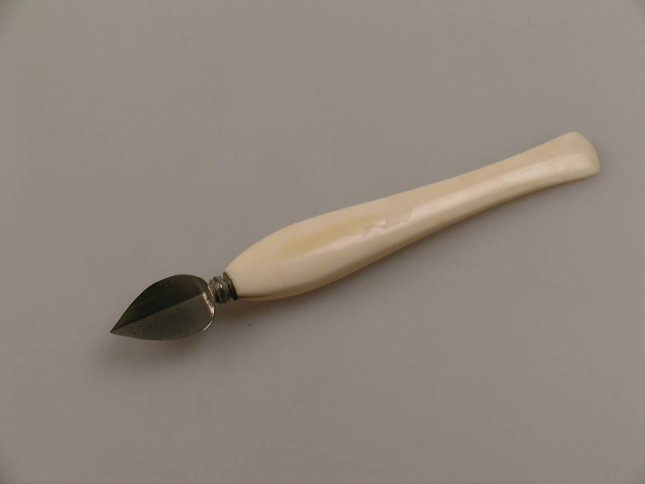 Bisturi con impugnatura di avorio e lama di acciaio, a foglia di mirto, appuntita, tagliente su entrambi i lati e leggermente ispessita al centro.
