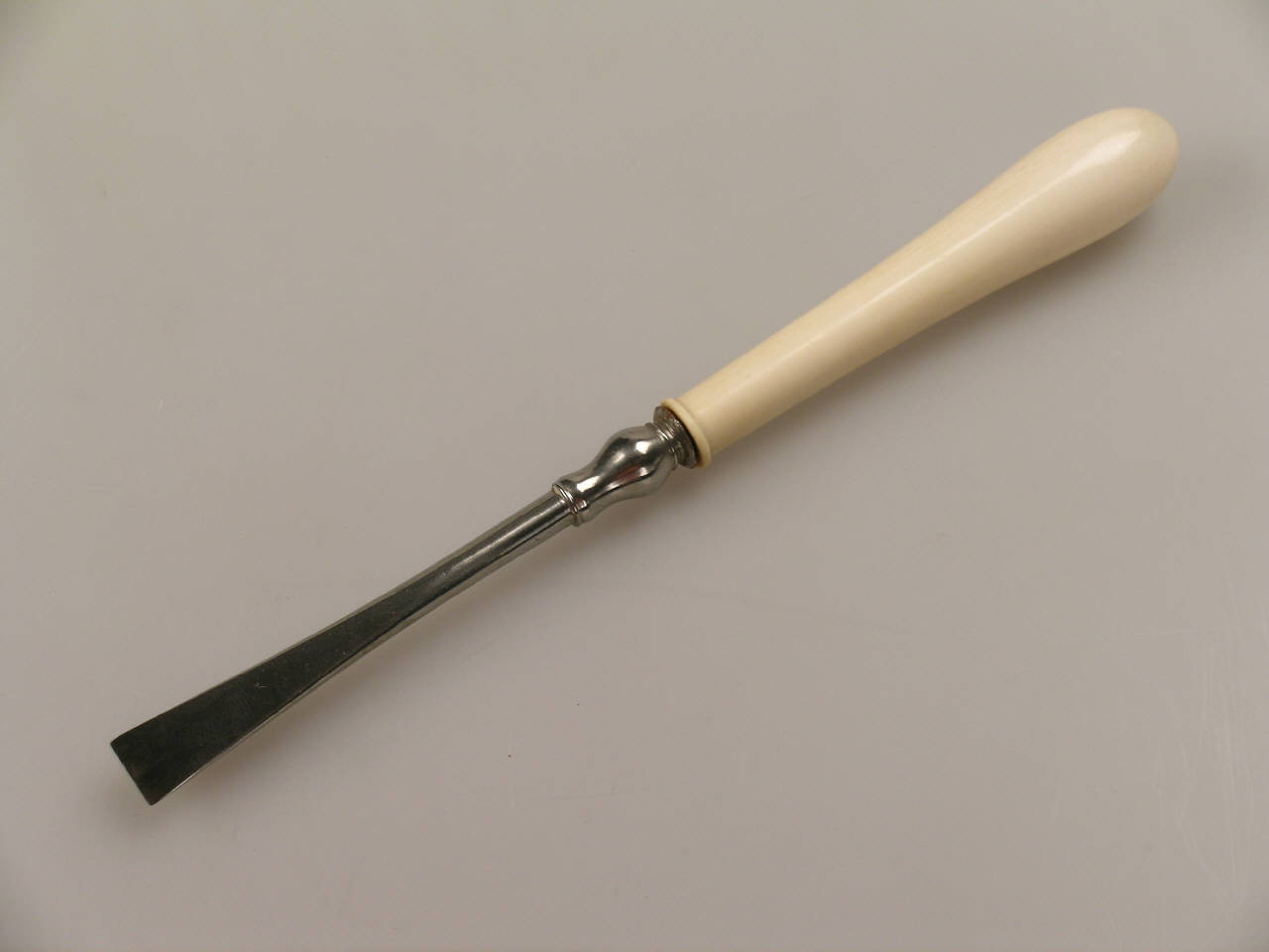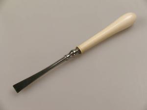 Su un manico in avorio a sezione circolare si innesta uno scalpello con l'estremità piatta e leggermente tagliente.