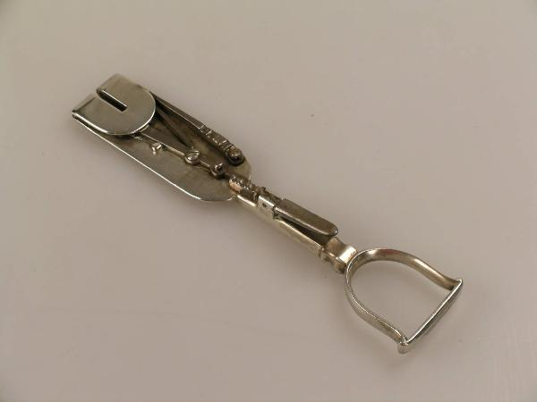 Strumento composto da una placchetta d'argento, munita di un manico terminante in un occhiello sagomato. All'estremità opposta la placchetta si ripiega su se stessa e presenta al centro una scanalatura, Sulla placchetta è fissata una piccola lama che, grazie a un meccanismo a scatto si muove entro la piega della placchetta.